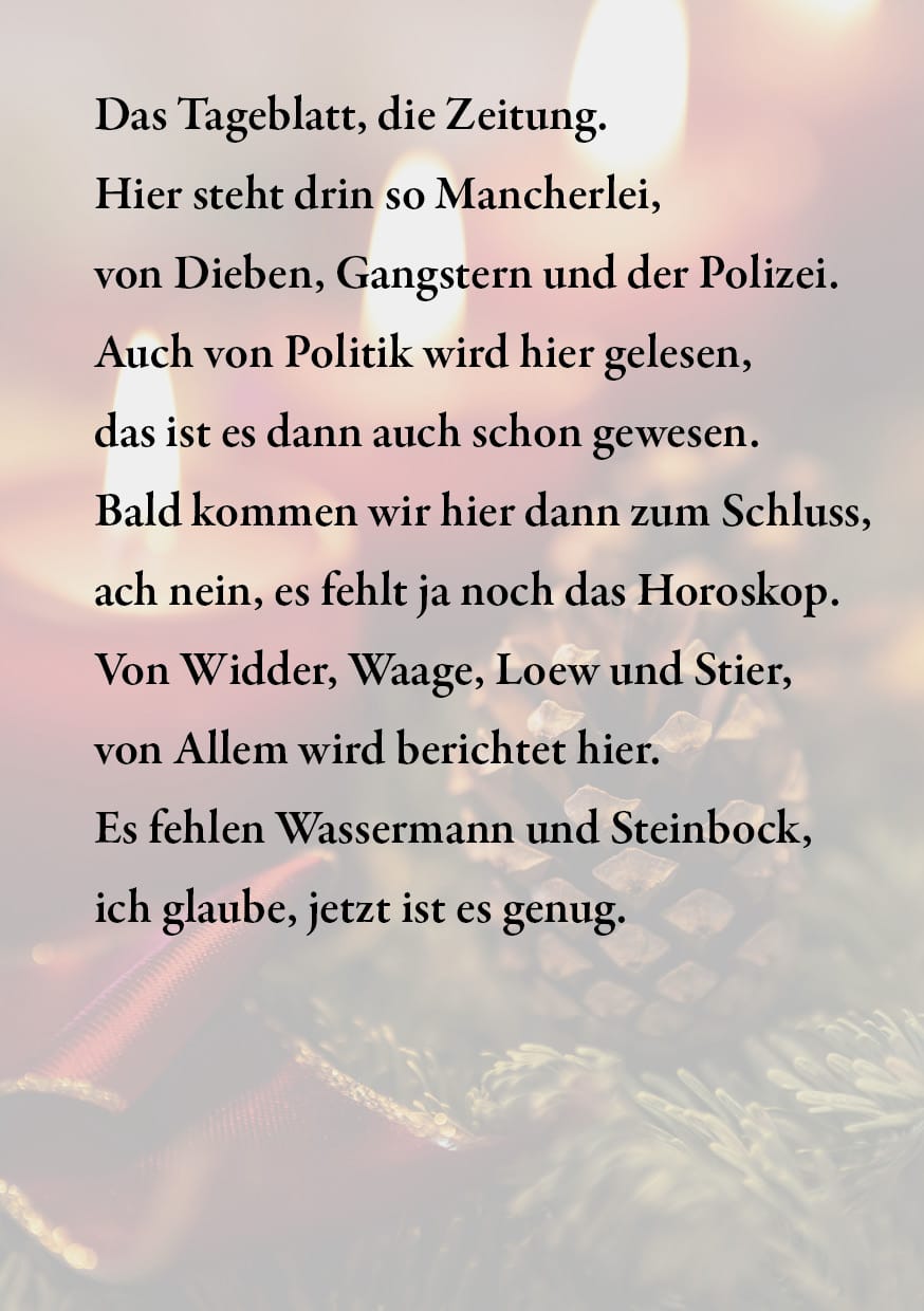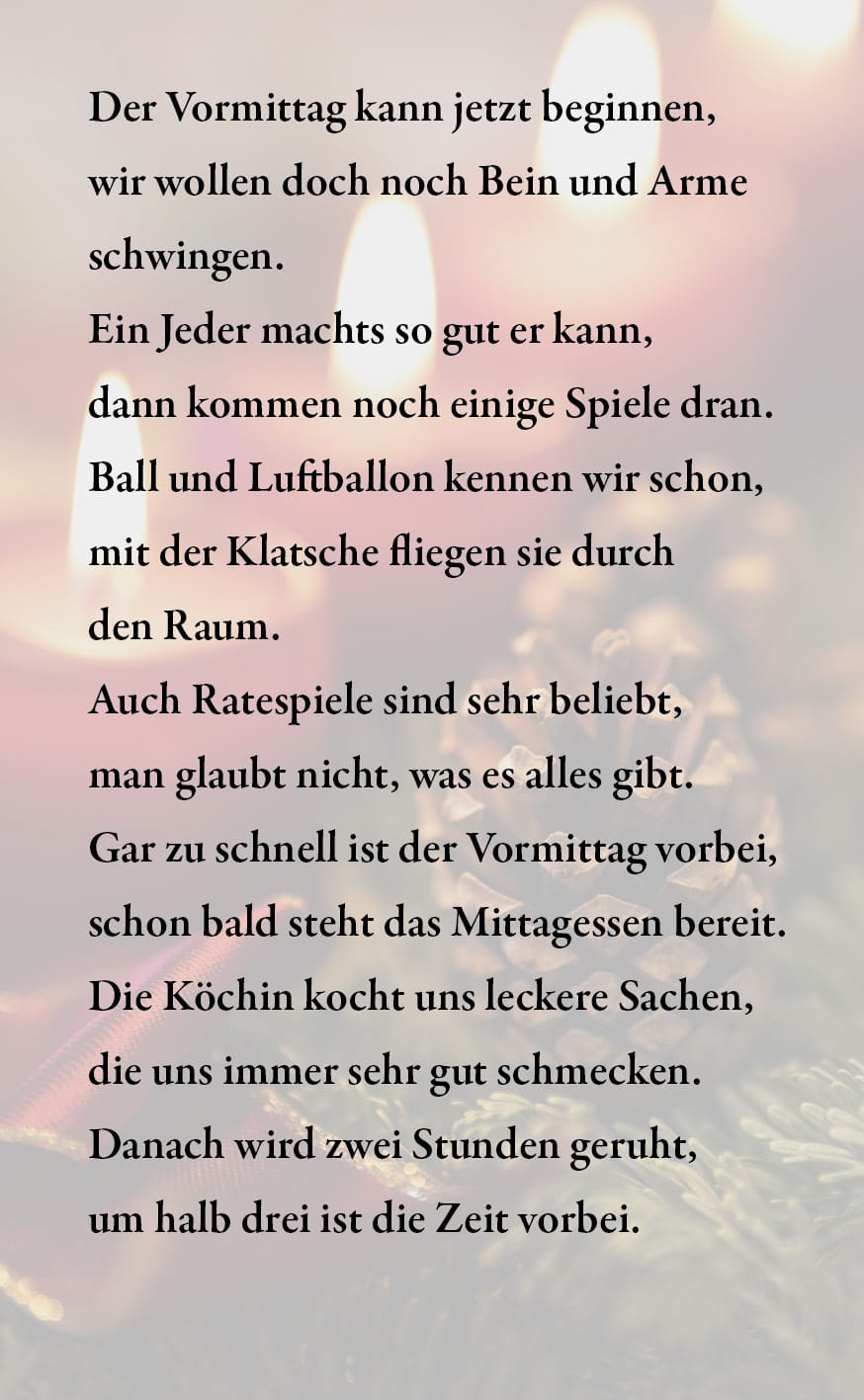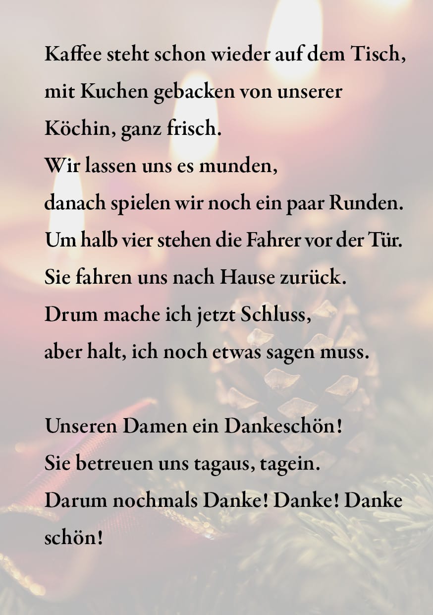 Unsere treue TagesGästin Frieda Heidbreder hat sich die Mühe gemacht und etwas über unsere Tagespflege in Reim- und Versform gebracht: Die ultimative Lobhudelei der Vorweihnachtszeit bei Daheim – danke von uns allen zurück, liebe Frieda Heidbreder!