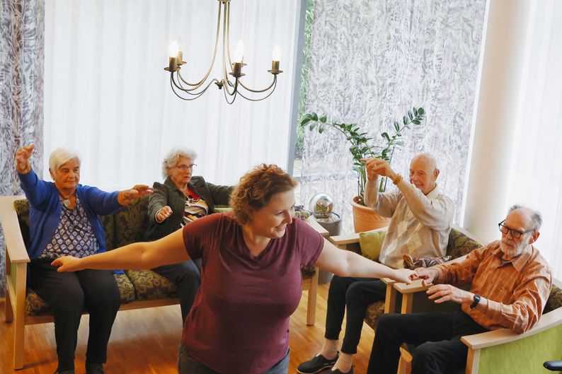 Unsere Mitarbeiter der internen ambulanten Ergotherapie bieten exklusiv den Bewohnerinnen und Bewohnern der Hausgemeinschaften ein fein abgestimmtes Programm zur Mobilisierung und individuellen Motivation.